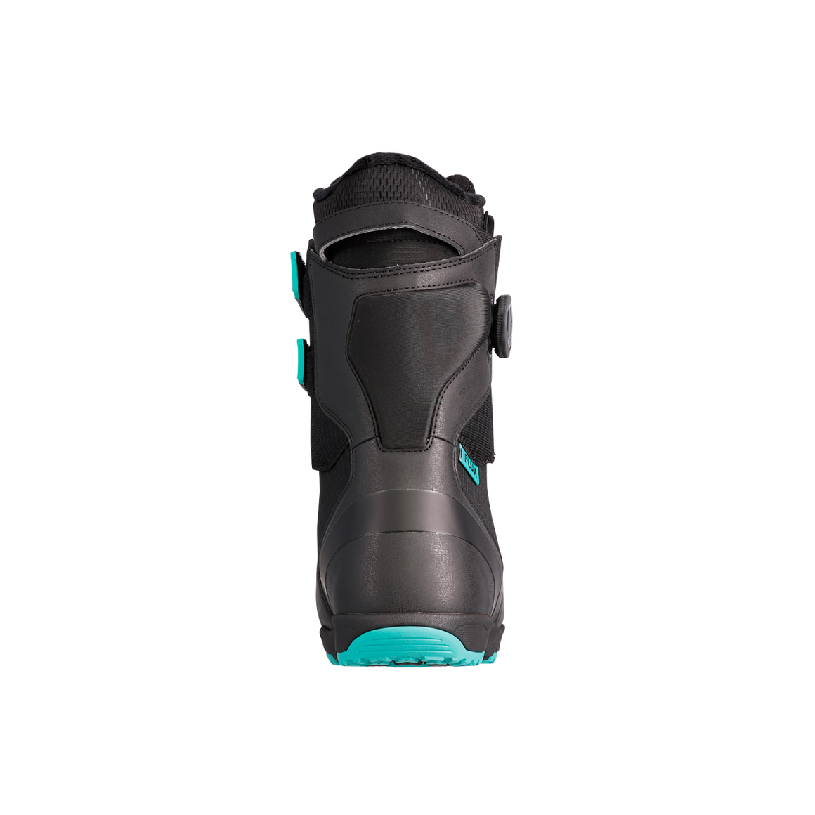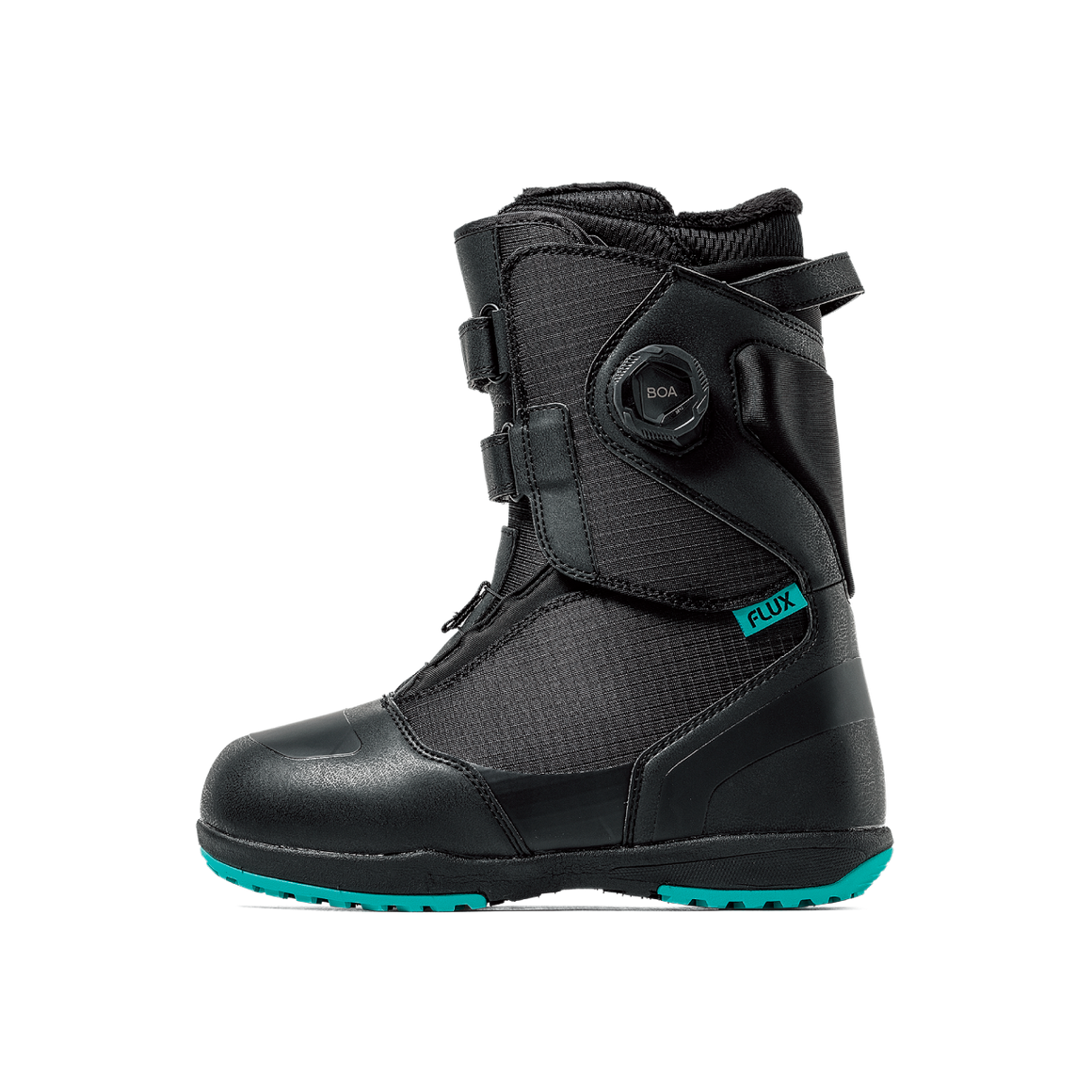 The boot structure is divided into a lower and upper part, which puts less stress on boot flex, and features an asymmetrical design on the inside and outside.