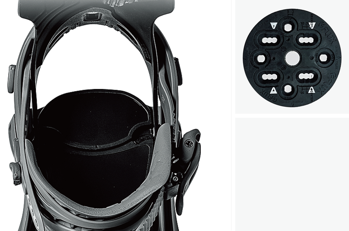 ヒールカップとハイバックの間にストラップベルトを取りつけることで、360°方向からブーツ包み込むシステム。これにより自然なホールド感と圧力の均一化を実現。