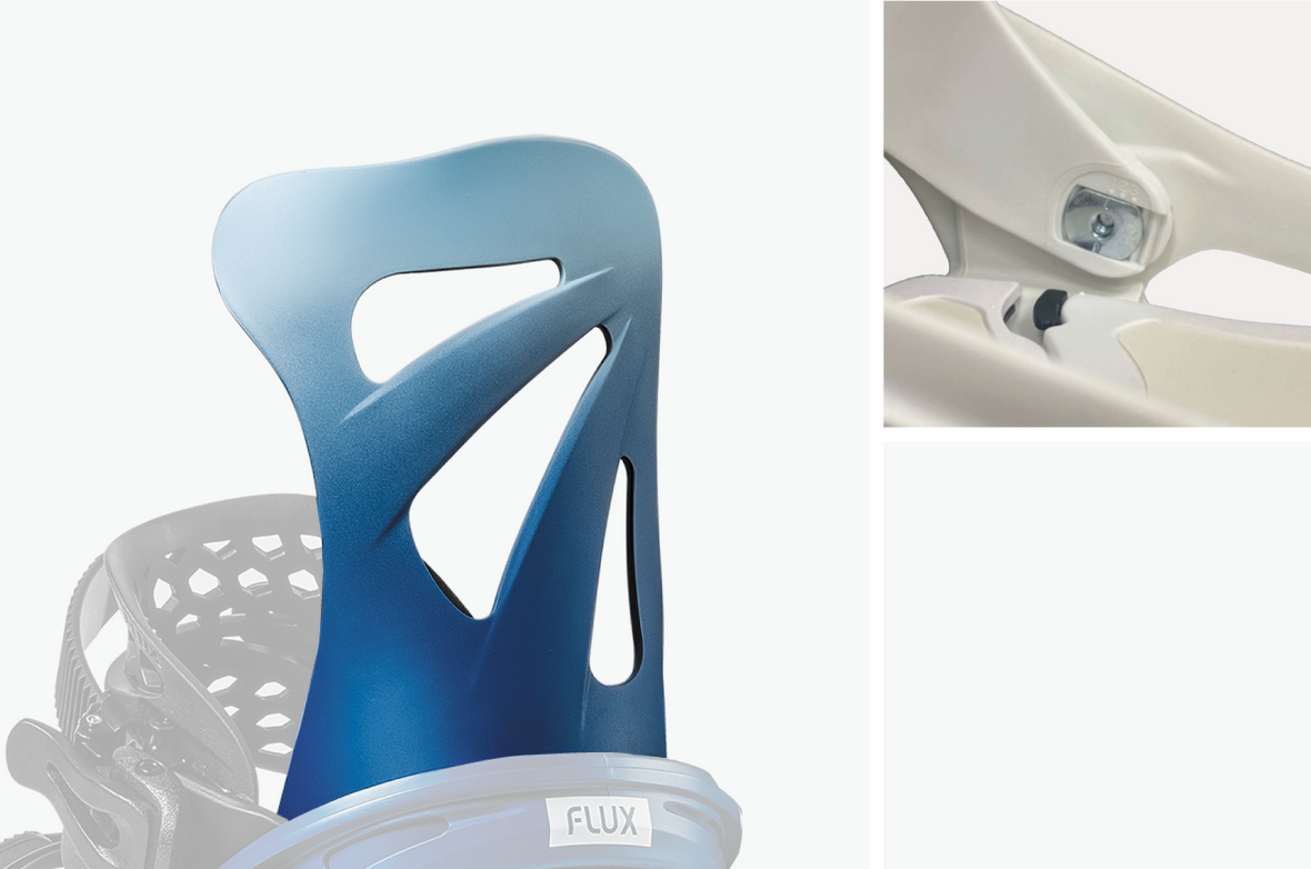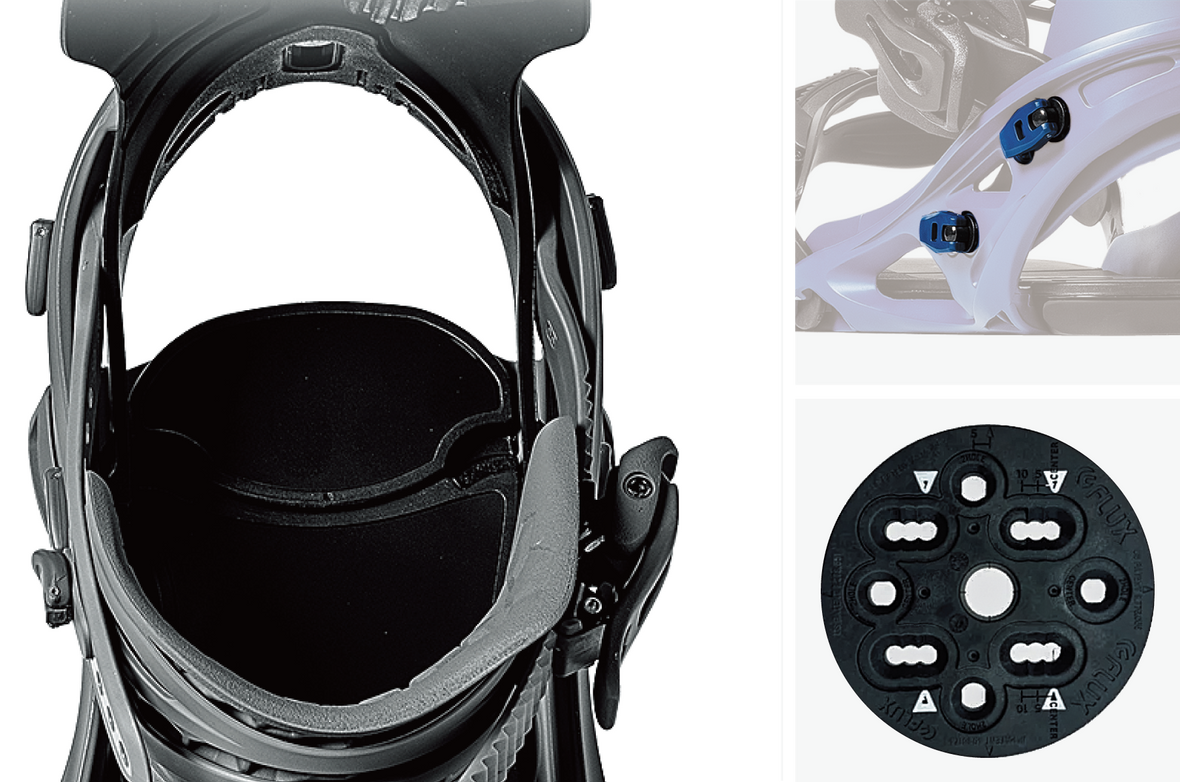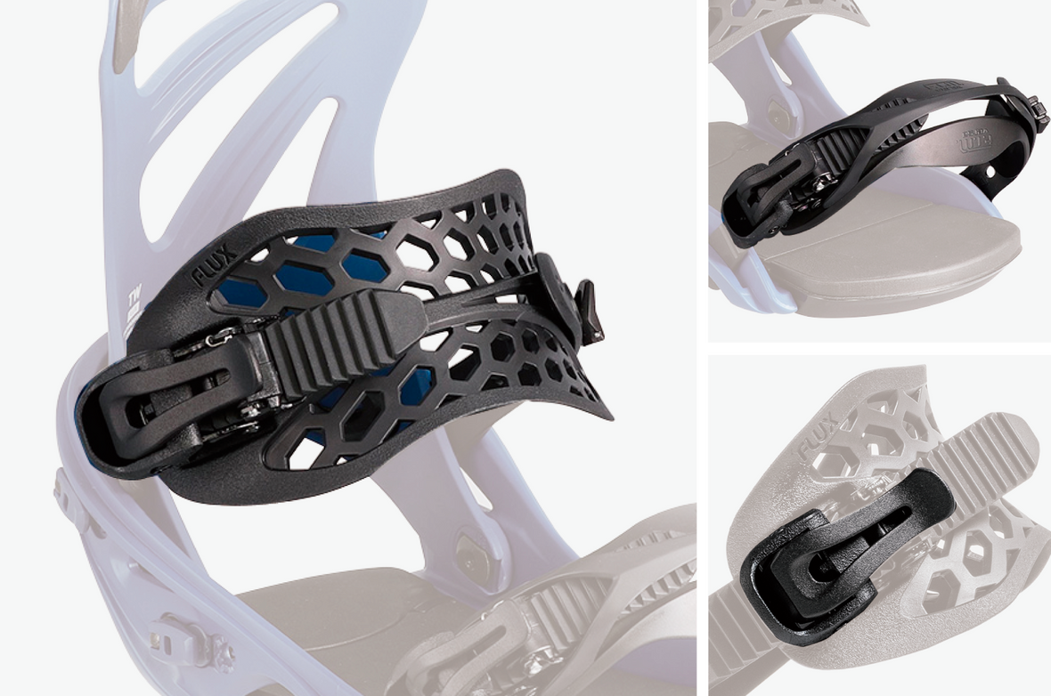 ヒールカップとハイバックの間にストラップベルトを取りつけることで、360°方向からブーツ包み込むシステム。これにより自然なホールド感と圧力の均一化を実現。