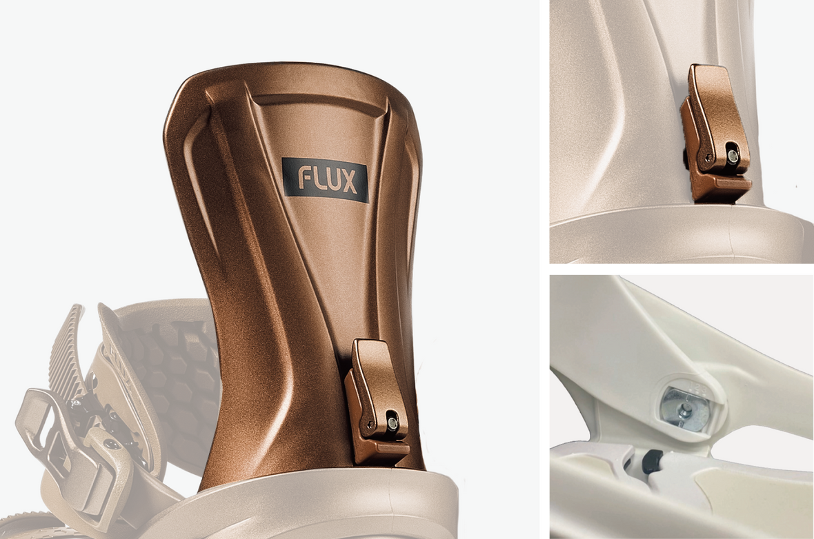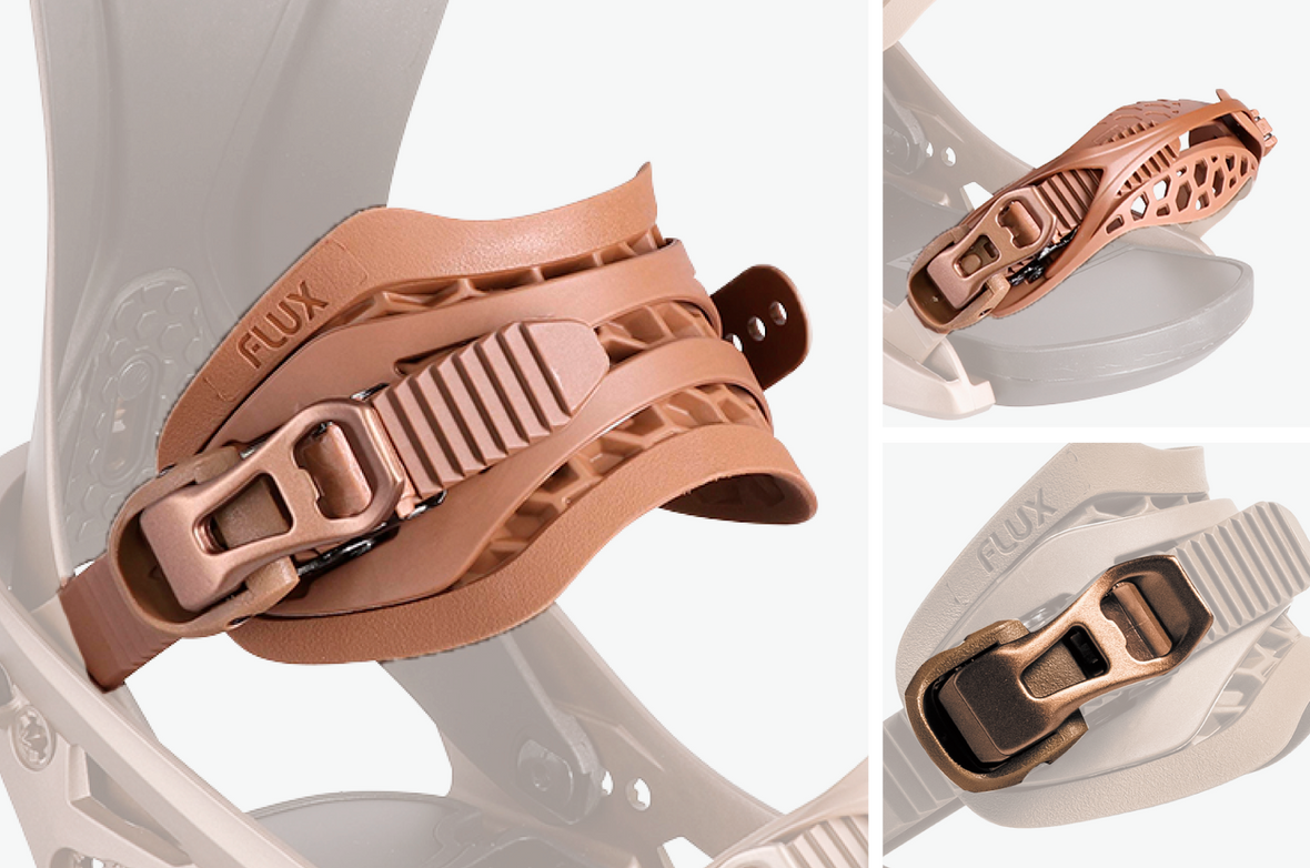 ヒールカップとハイバックの間にストラップベルトを取りつけることで、360°方向からブーツ包み込むシステム。これにより自然なホールド感と圧力の均一化を実現。