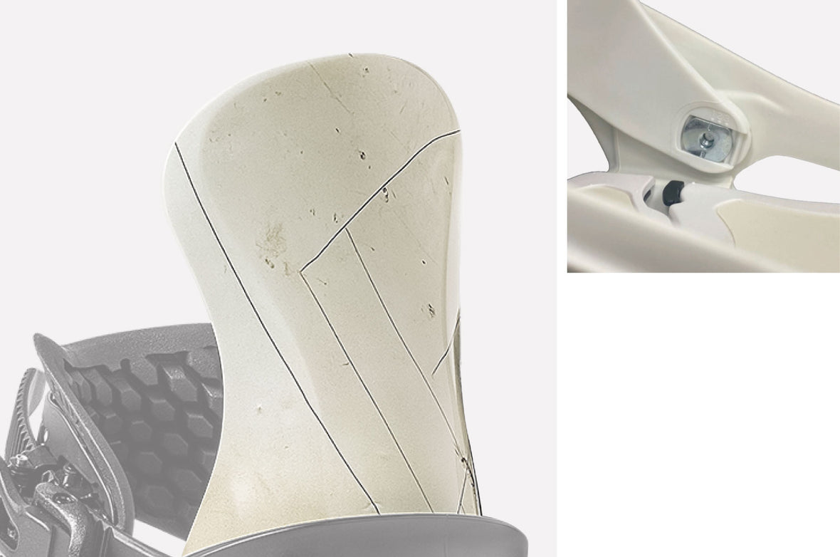 ヒールカップとハイバックの間にストラップベルトを取りつけることで、360°方向からブーツ包み込むシステム。これにより自然なホールド感と圧力の均一化を実現。