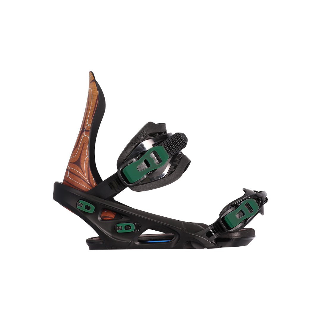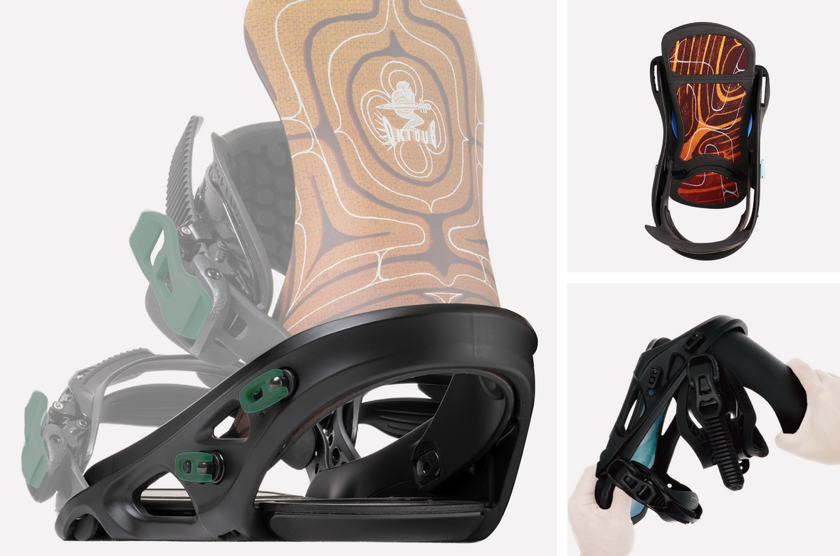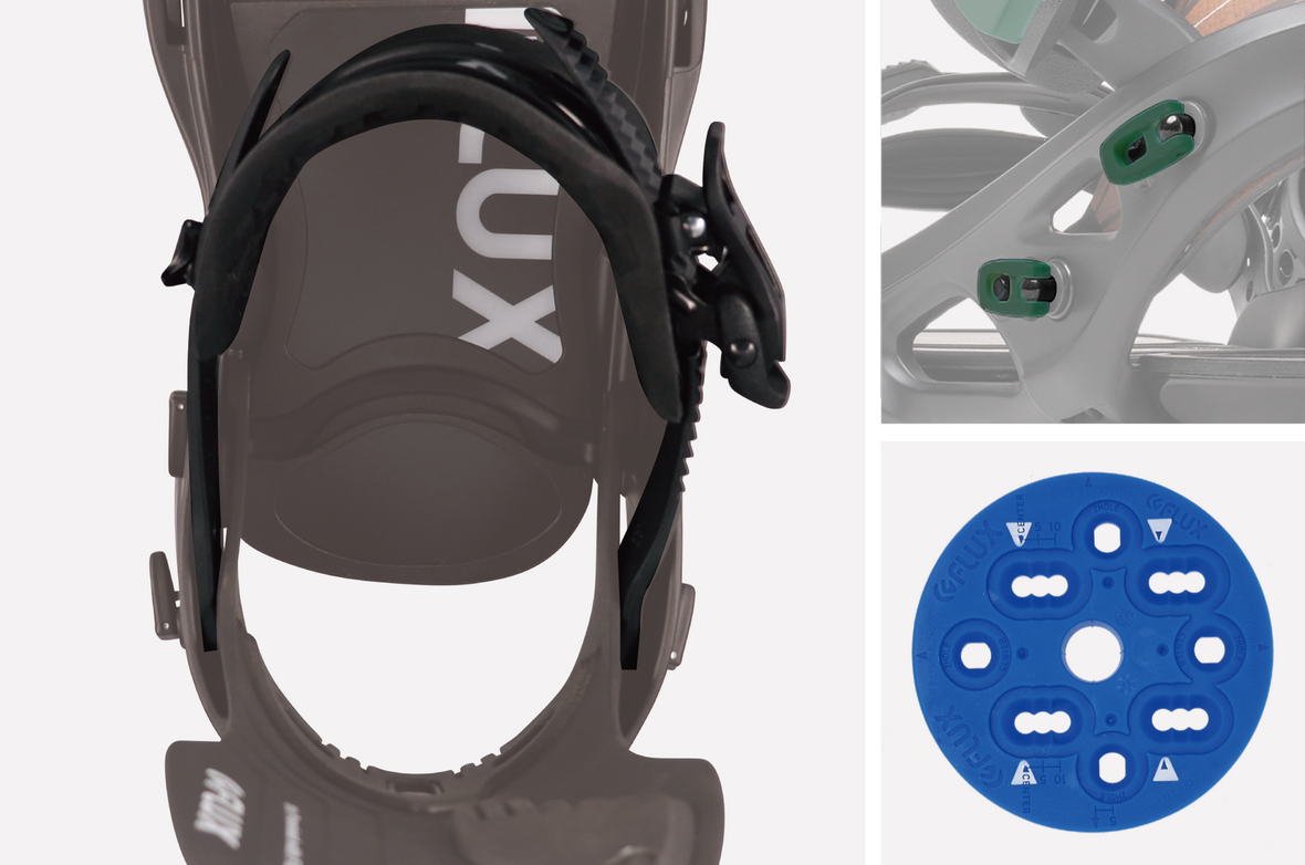 ヒールカップとハイバックの間にストラップベルトを取りつけることで、360°方向からブーツ包み込むシステム。これにより自然なホールド感と圧力の均一化を実現。