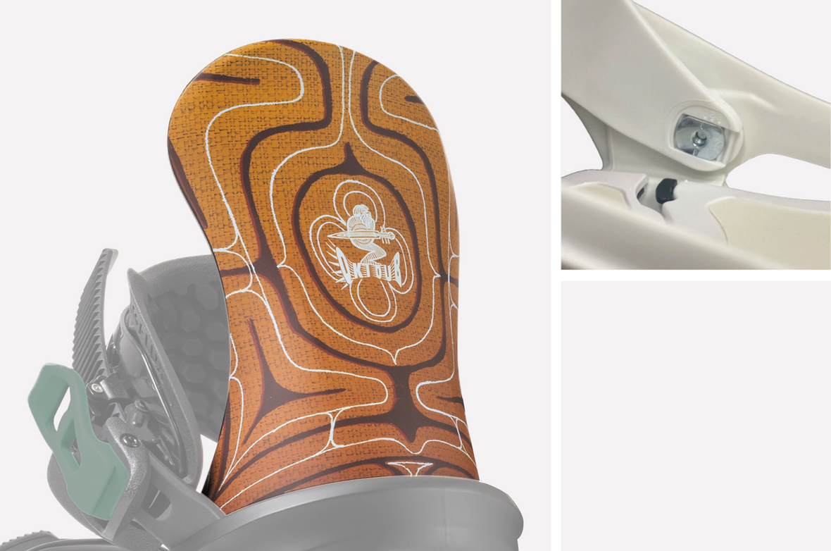ブーツサイズやボード幅に合わせてトーサイド、ヒールサイトそれぞれの調整が可能な可動式クッション。