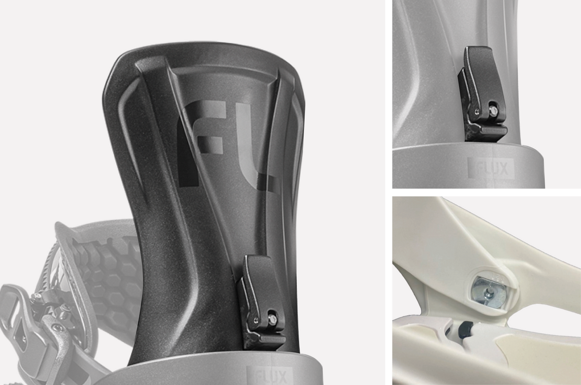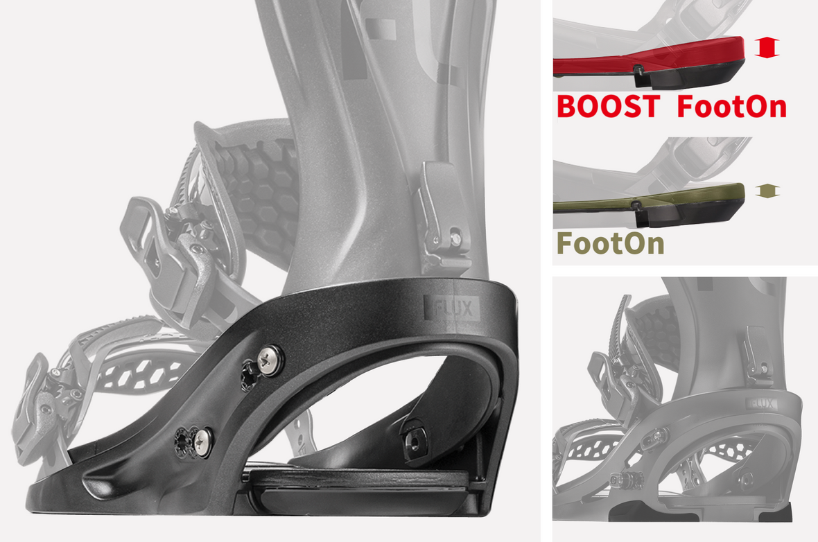 ボードへの力の伝達効率を重視したベース設計はそのままに、大型のスタビライザーをヒールサイドに採用。反発性に優れた素材を使用することで左右への可動域を拡げながらもボードに力を逃がすことなく伝えることができます。